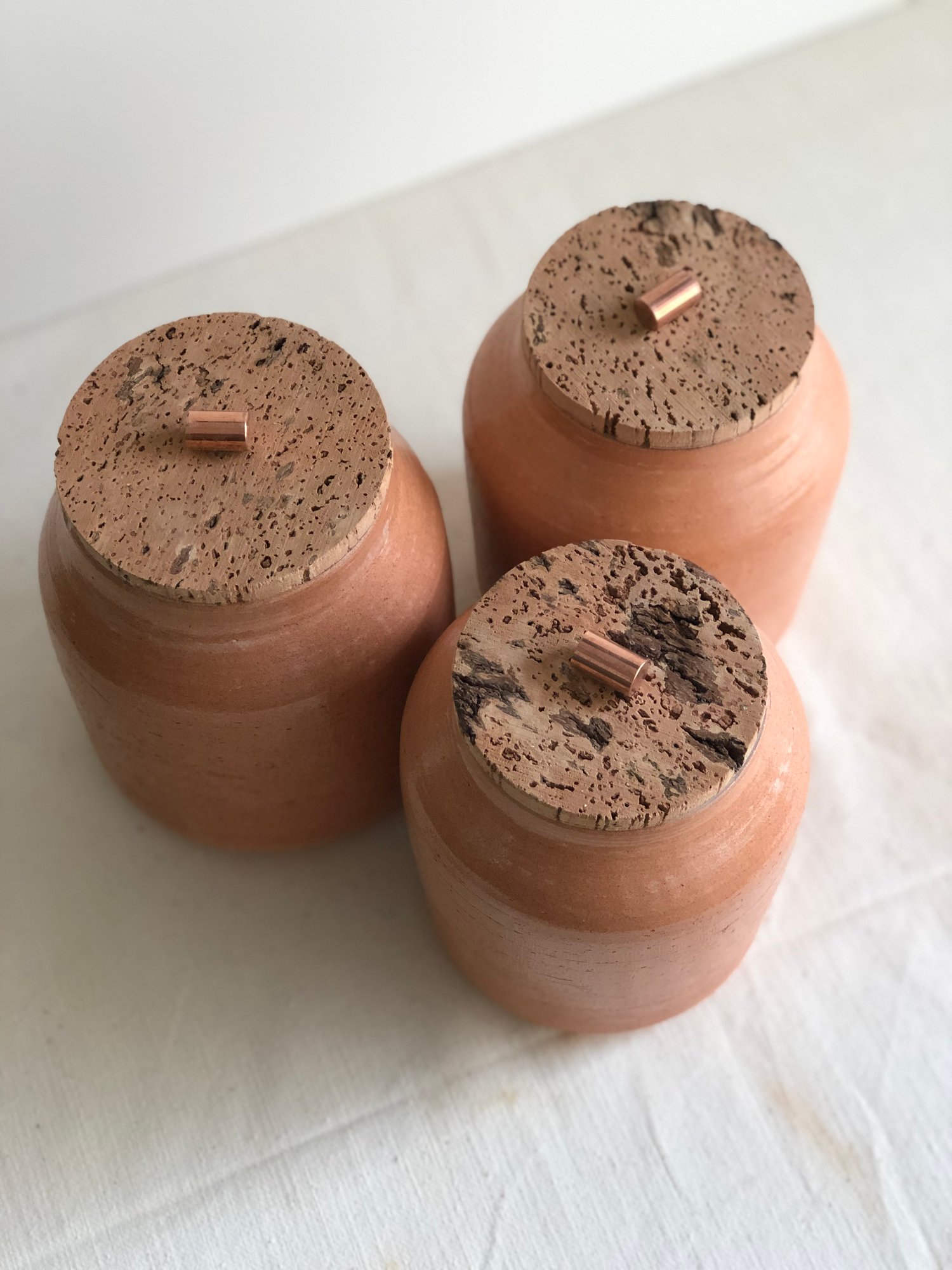 Made in terracota clay with a one of kind virgin cork lid with a copper handle.